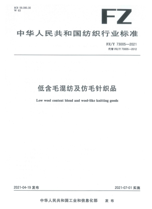 FZ/T 73005-2021 《低含毛混紡及仿毛針織品》