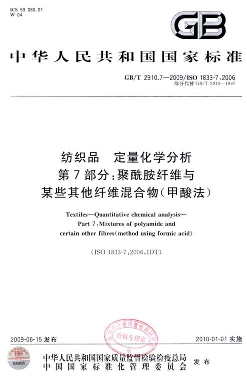 GB/T2910的本部分規(guī)定了采用二甲基甲酰胺法測定去除非纖維物質(zhì)后的由以下纖維組成的聚丙烯腈纖維、某些改性聚丙烯腈纖維、某些含氯纖維或某些彈性纖維與某些其他纖維的二組分混合物中聚丙烯腈纖維、某些改性聚丙烯腈纖維、某些含氯纖維或某些彈性纖維含量的方法;