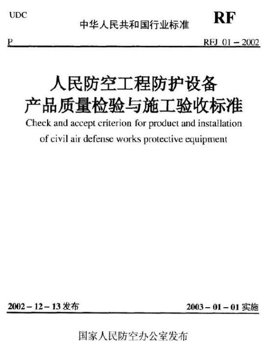 RFJ 01-2002 《人民防空工程防護(hù)設(shè)備產(chǎn)品質(zhì)量檢驗(yàn)與施工驗(yàn)收標(biāo)準(zhǔn)》